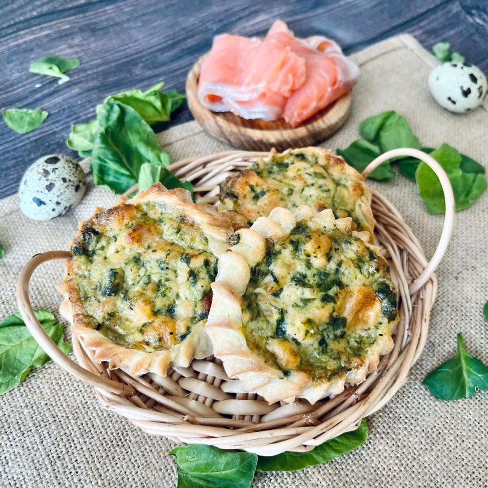 Перепечки с рыбой лососевых пород (лосось, форель, кижуч), шпинатом и нежной яичной заливкой.